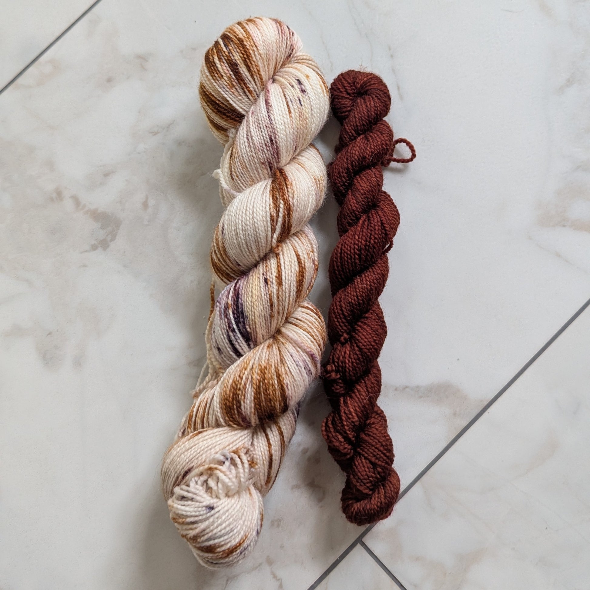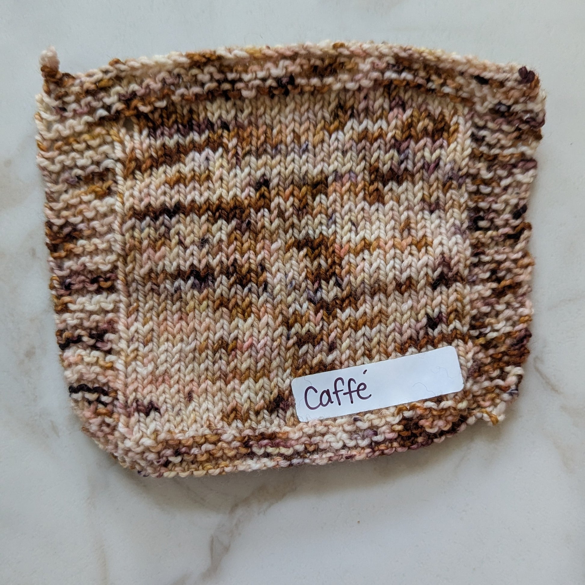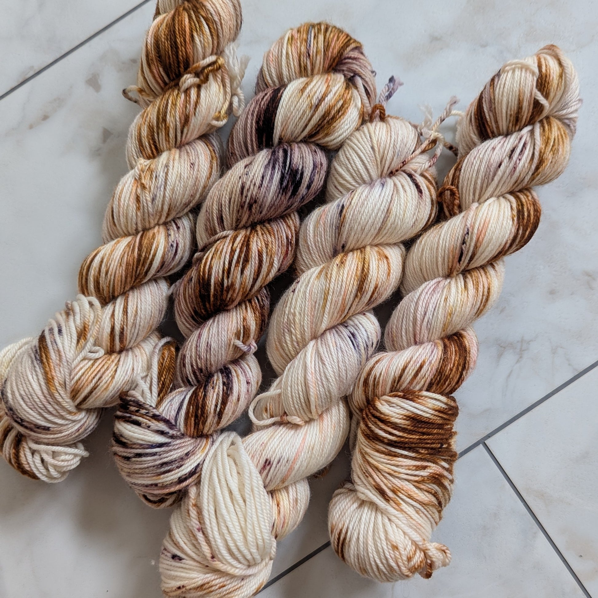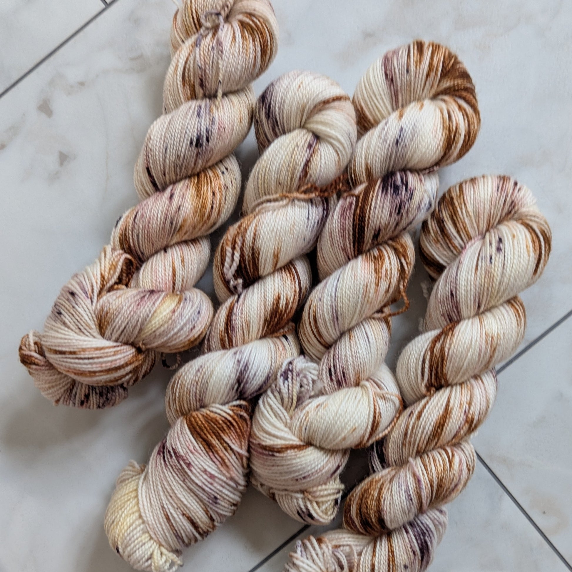 Caffe' is a warm variegated colorway with seven different brown and cream dye blends and speckles that create delicious layers of espresso, cream, foam, nutmeg, and cocoa powder. She's delish