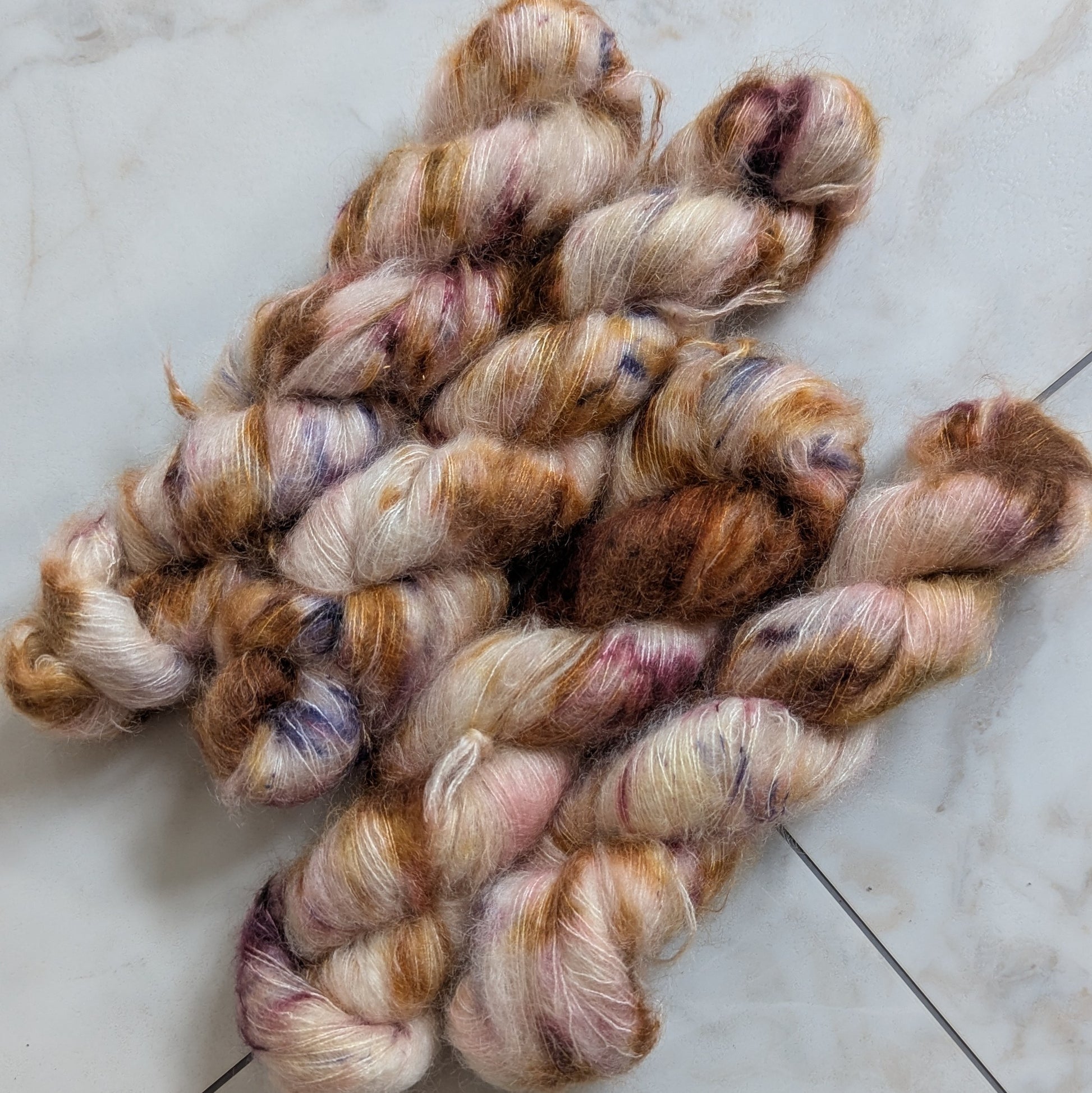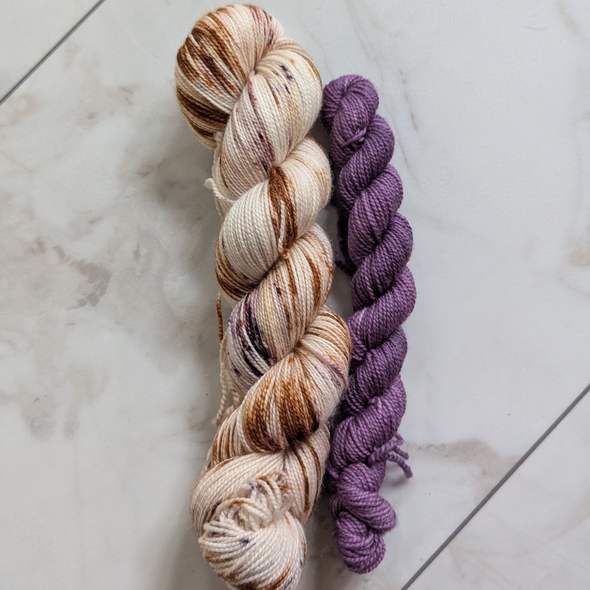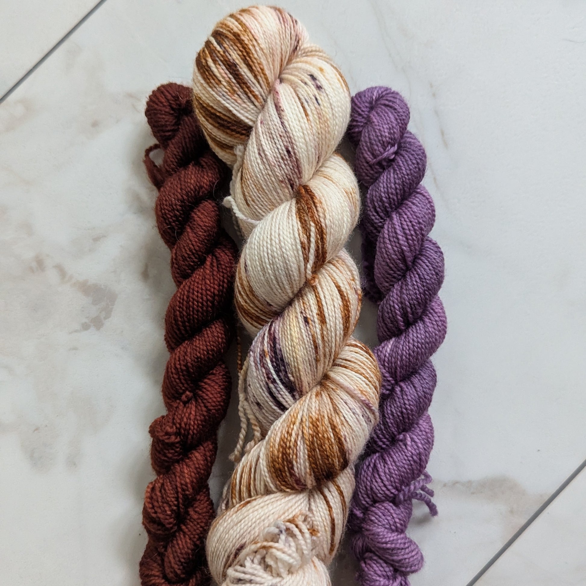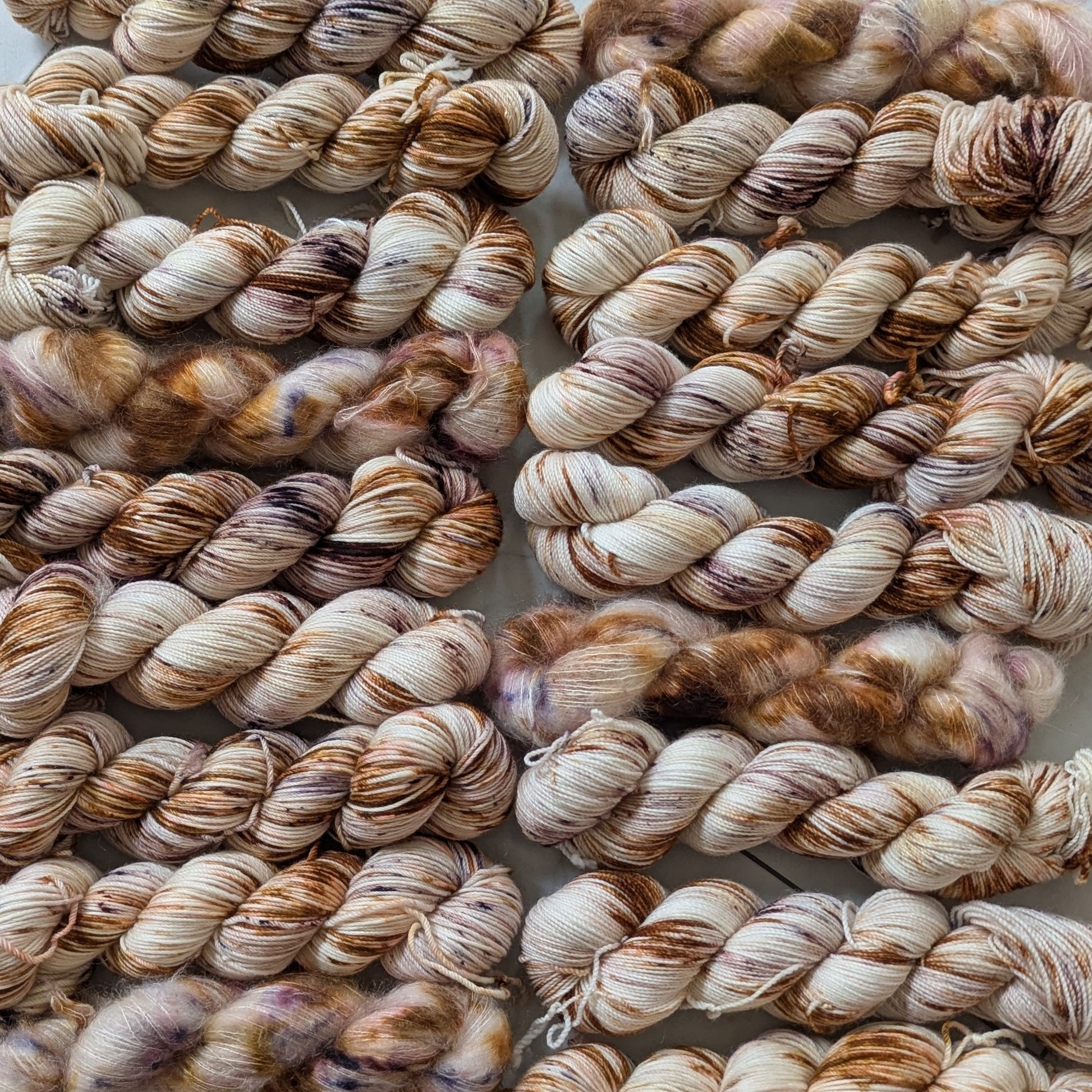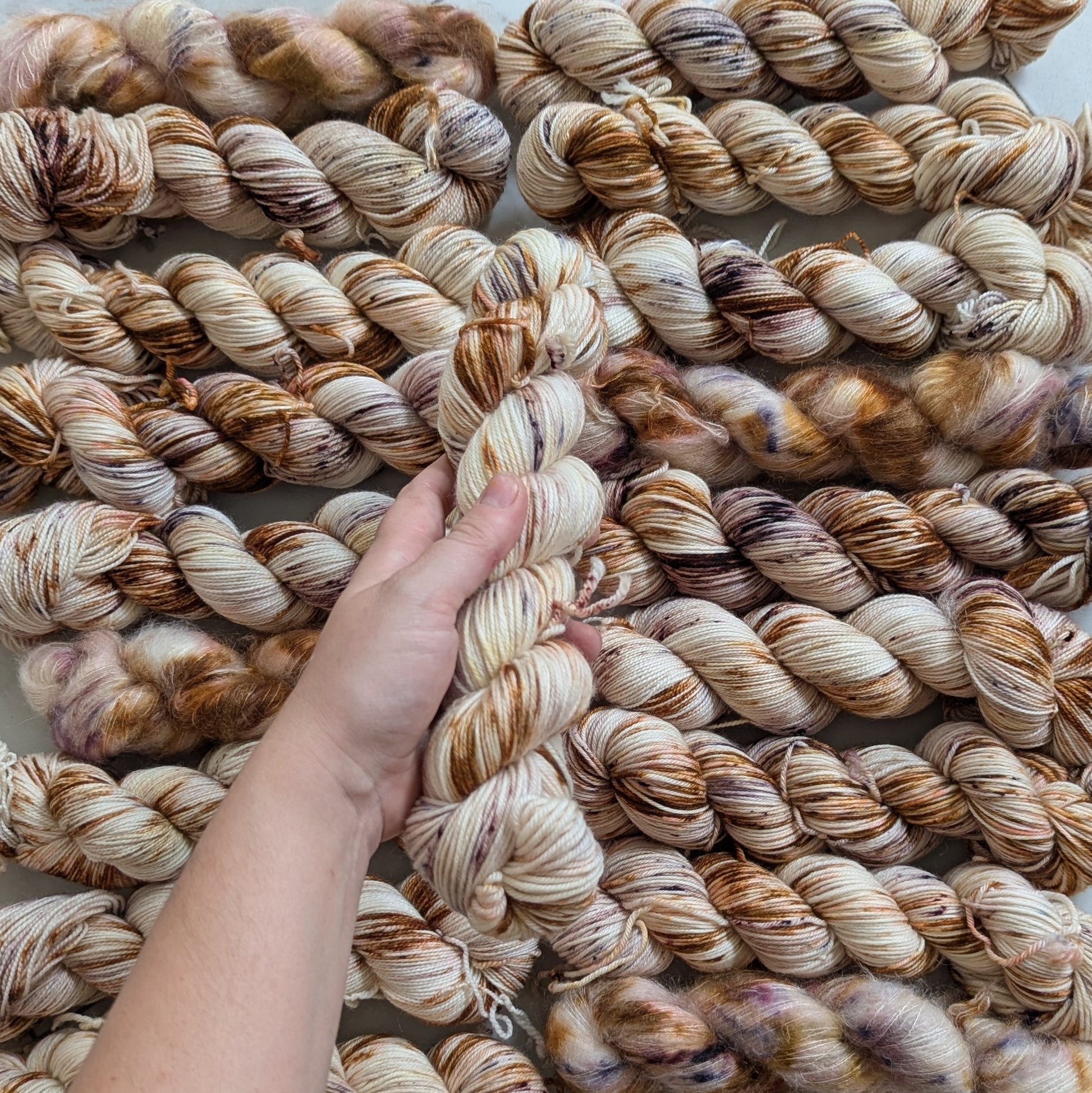 Caffe' is a warm variegated colorway with seven different brown and cream dye blends and speckles that create delicious layers of espresso, cream, foam, nutmeg, and cocoa powder. She's delish