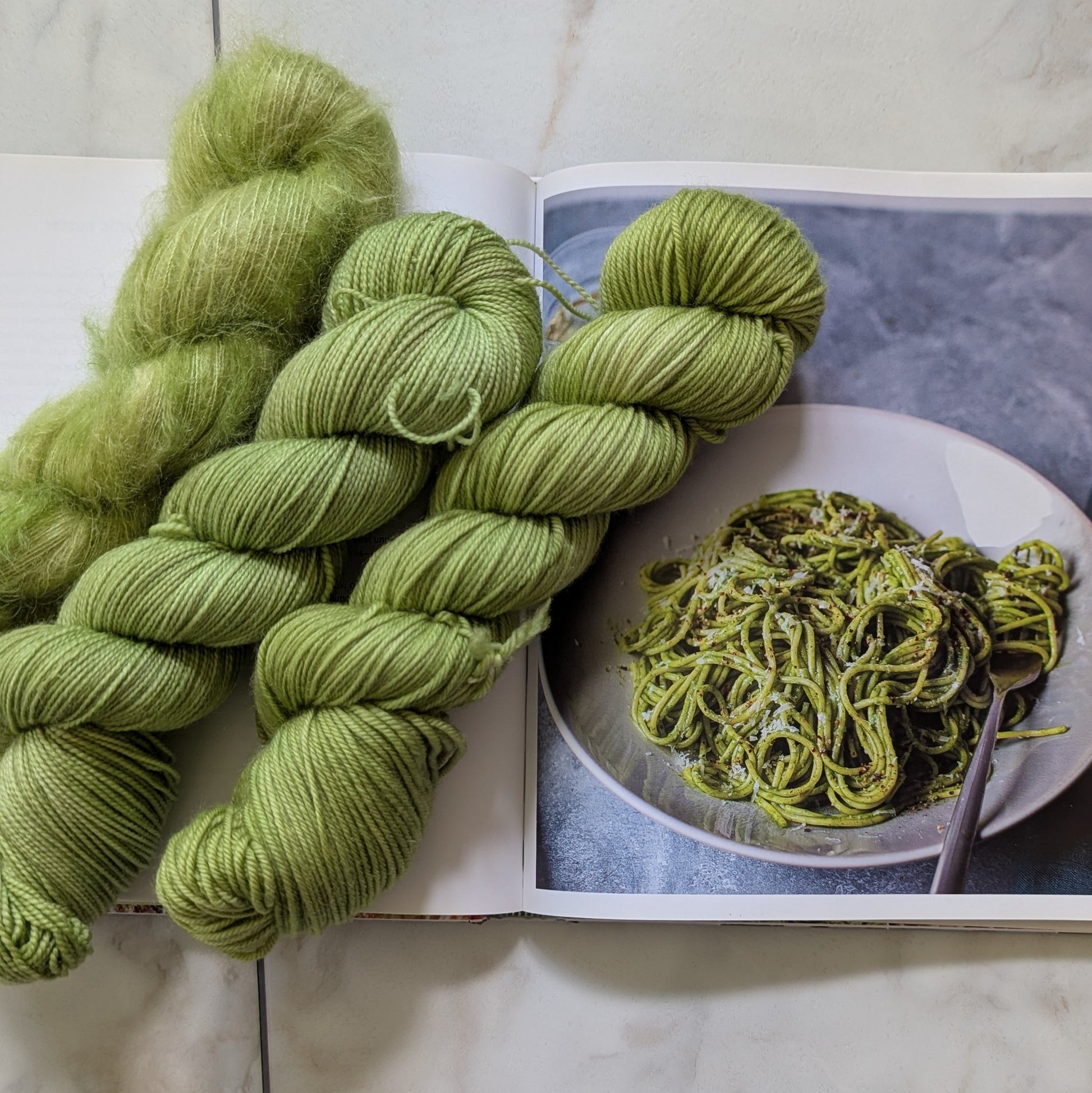 Keepers is inspired by the cover recipe of Smitten Kitchen Keepers - green angel hair with garlic butter. It's a bright verdant mid-toned green with undertones of gold and olive.