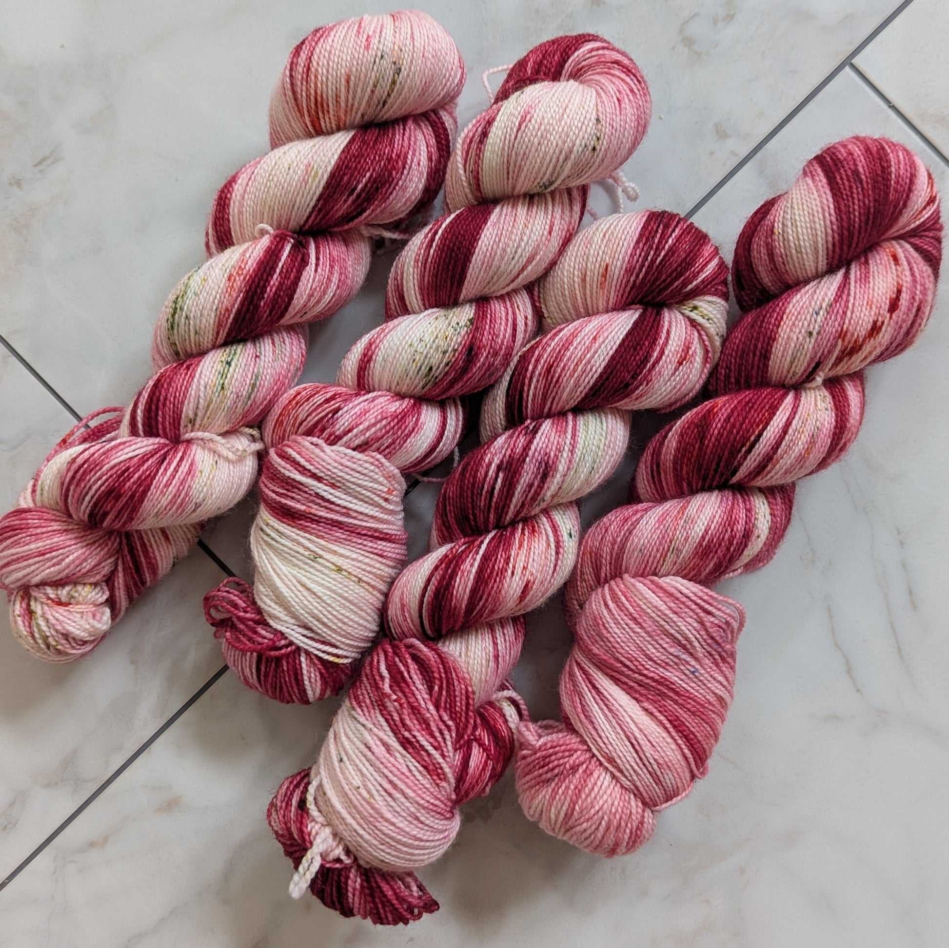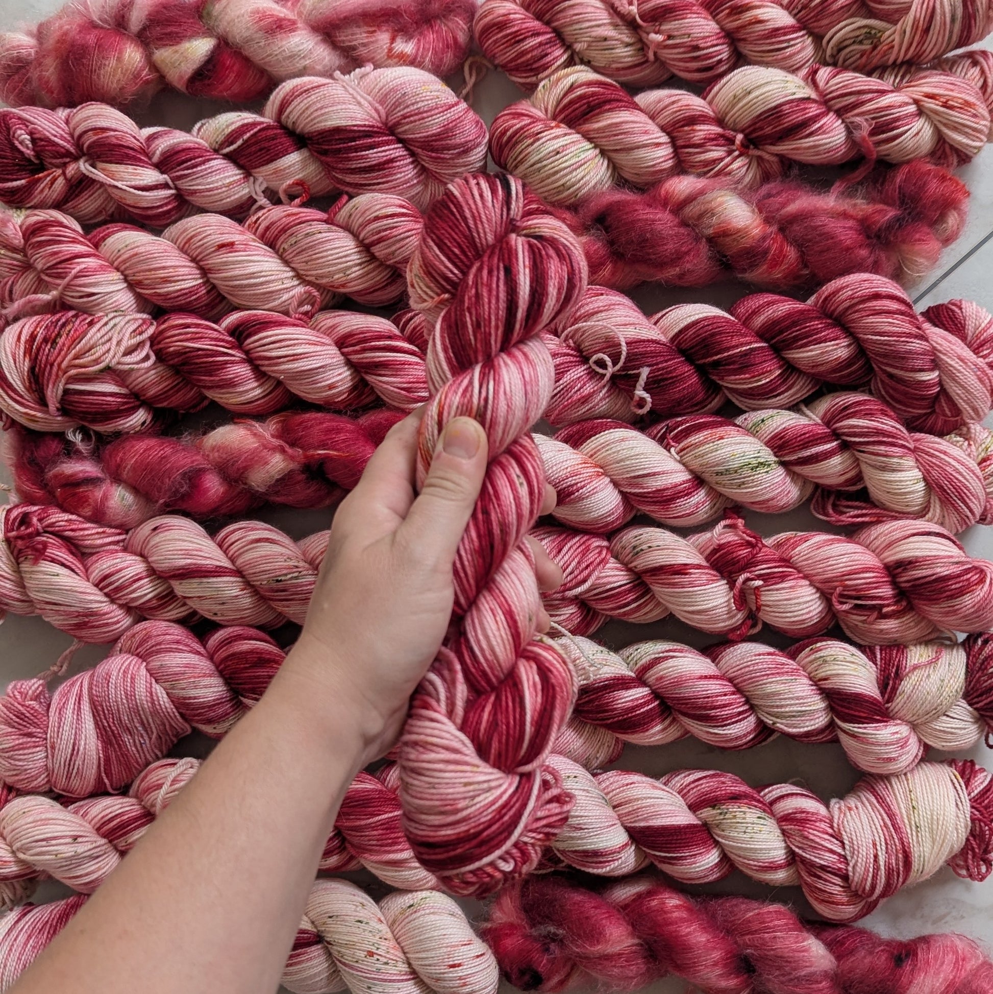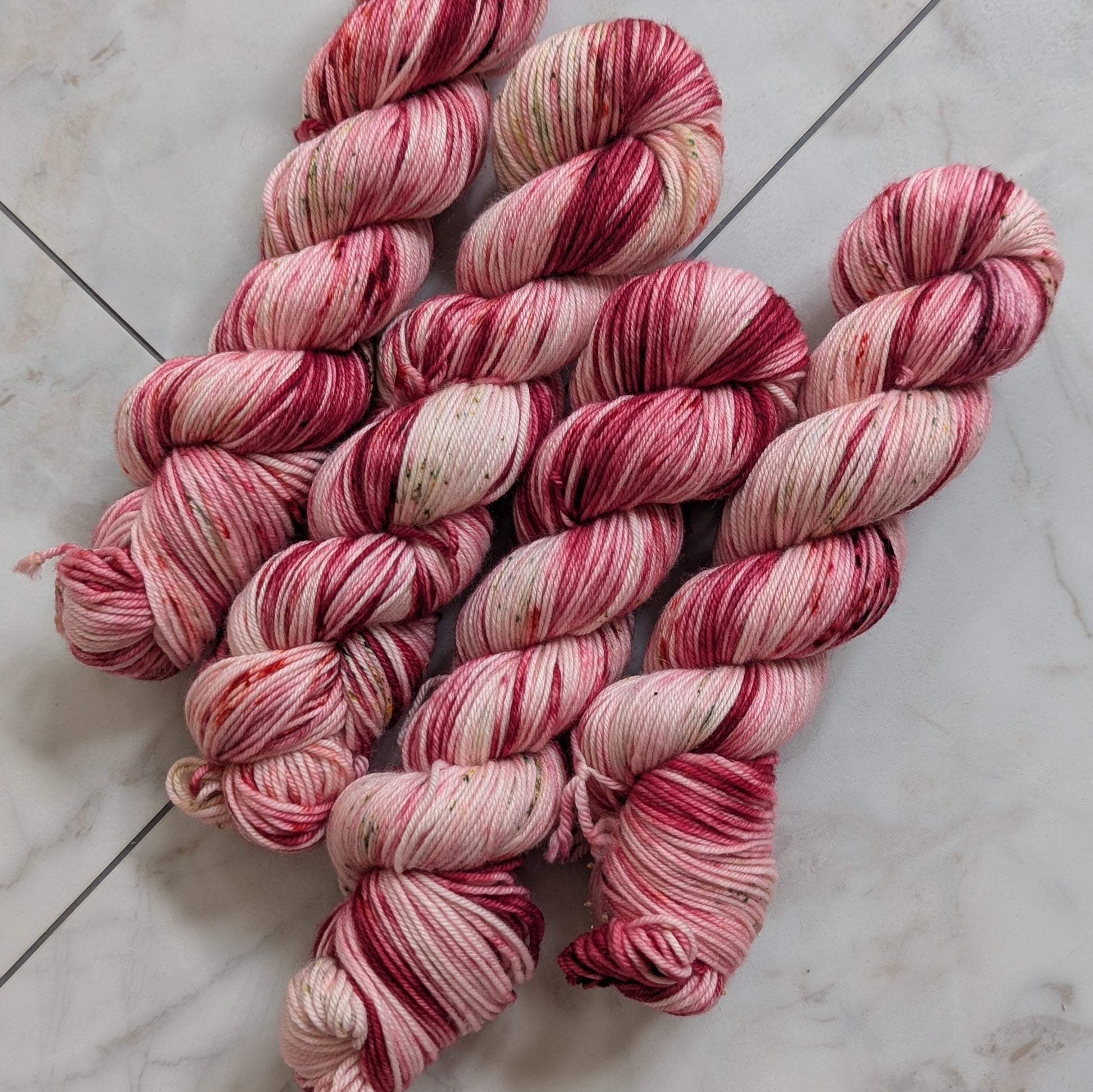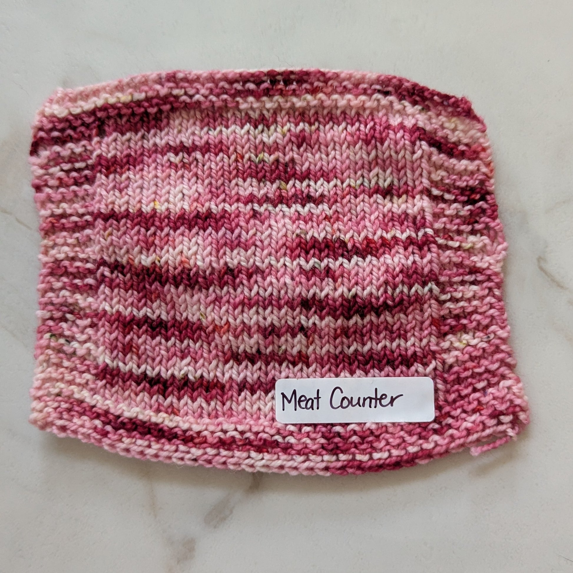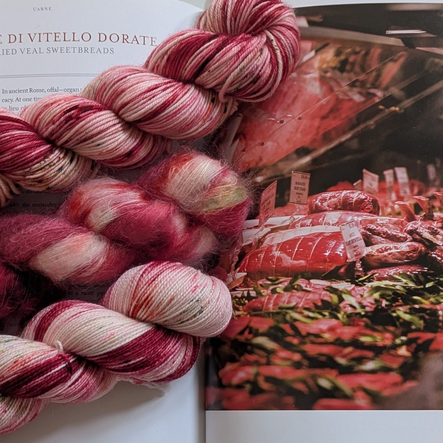 Meat Counter is a gently variegated colorway in which only one blended dye is poured over a bare base, and variations in the saturation level provide depth and interest. Then it's finished with sage and parsley speckles to garnish 💚
