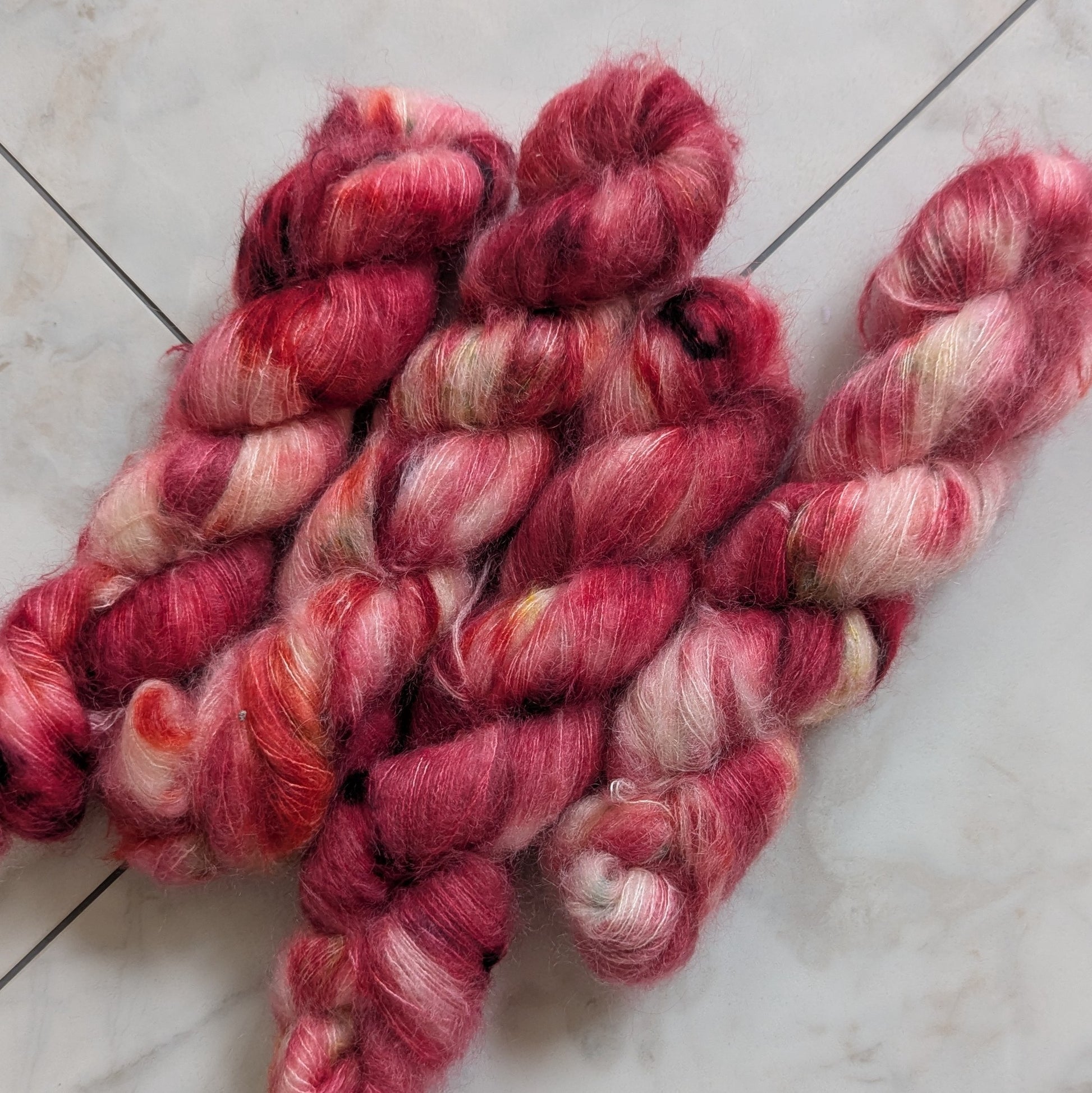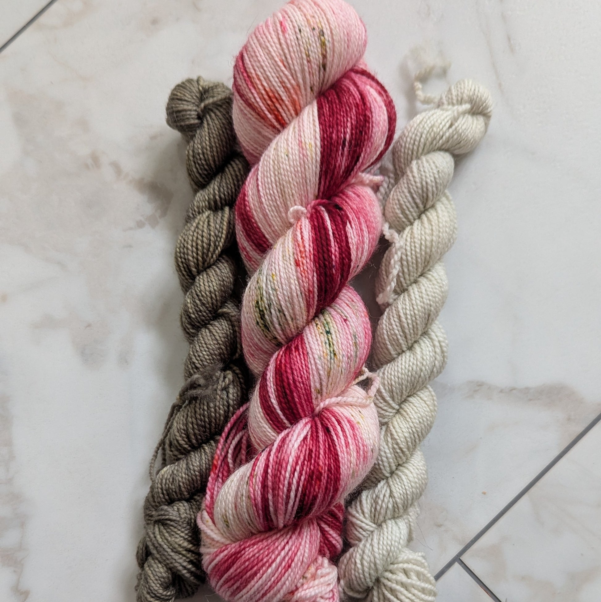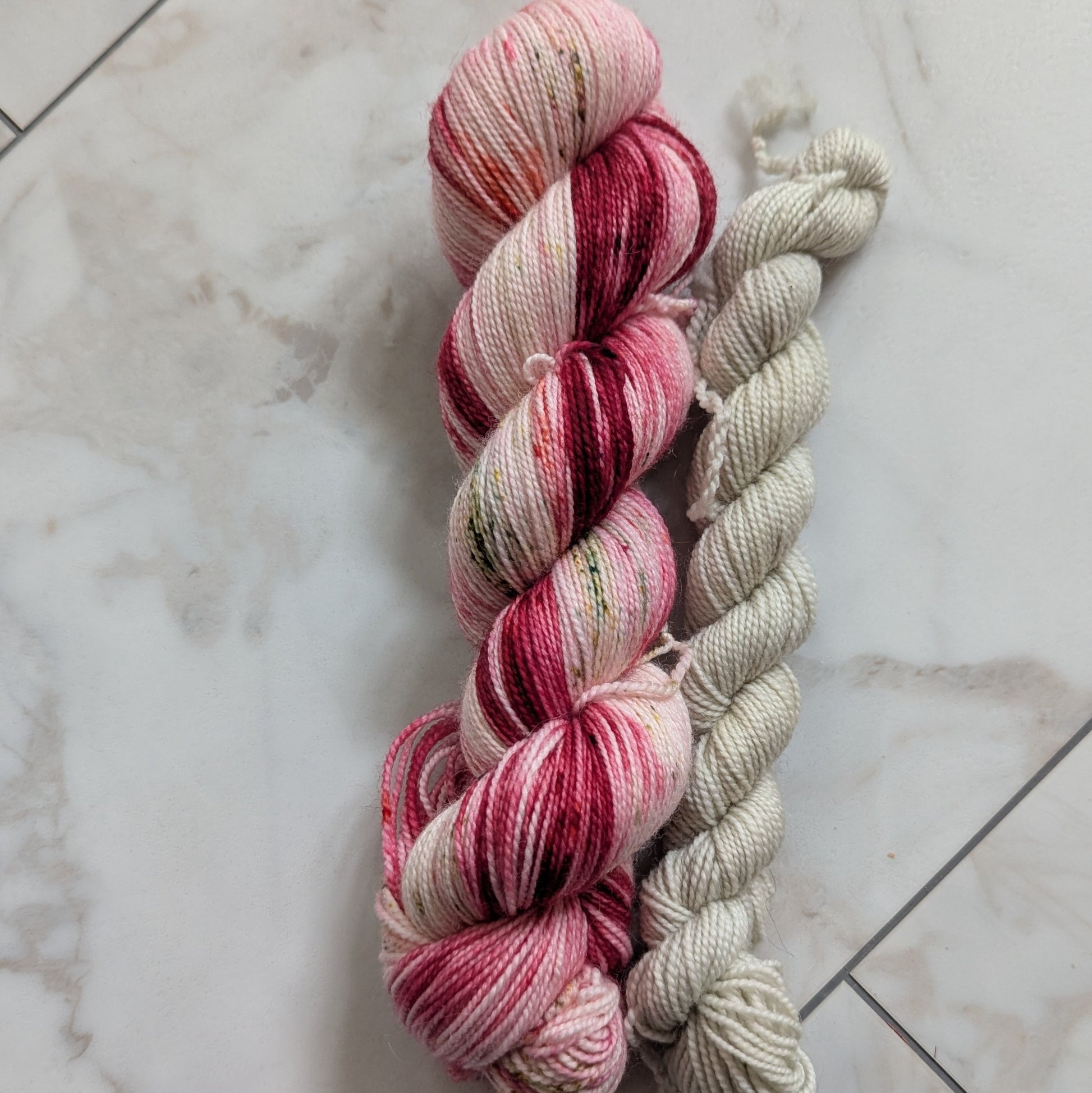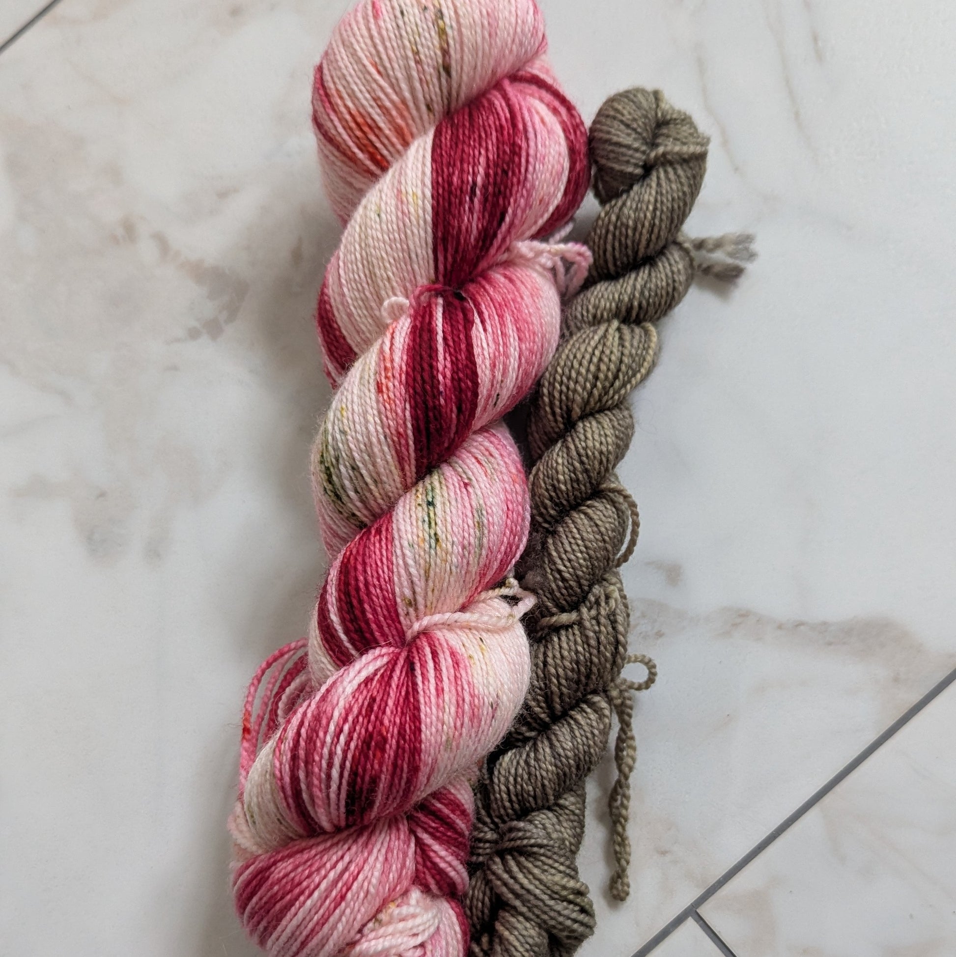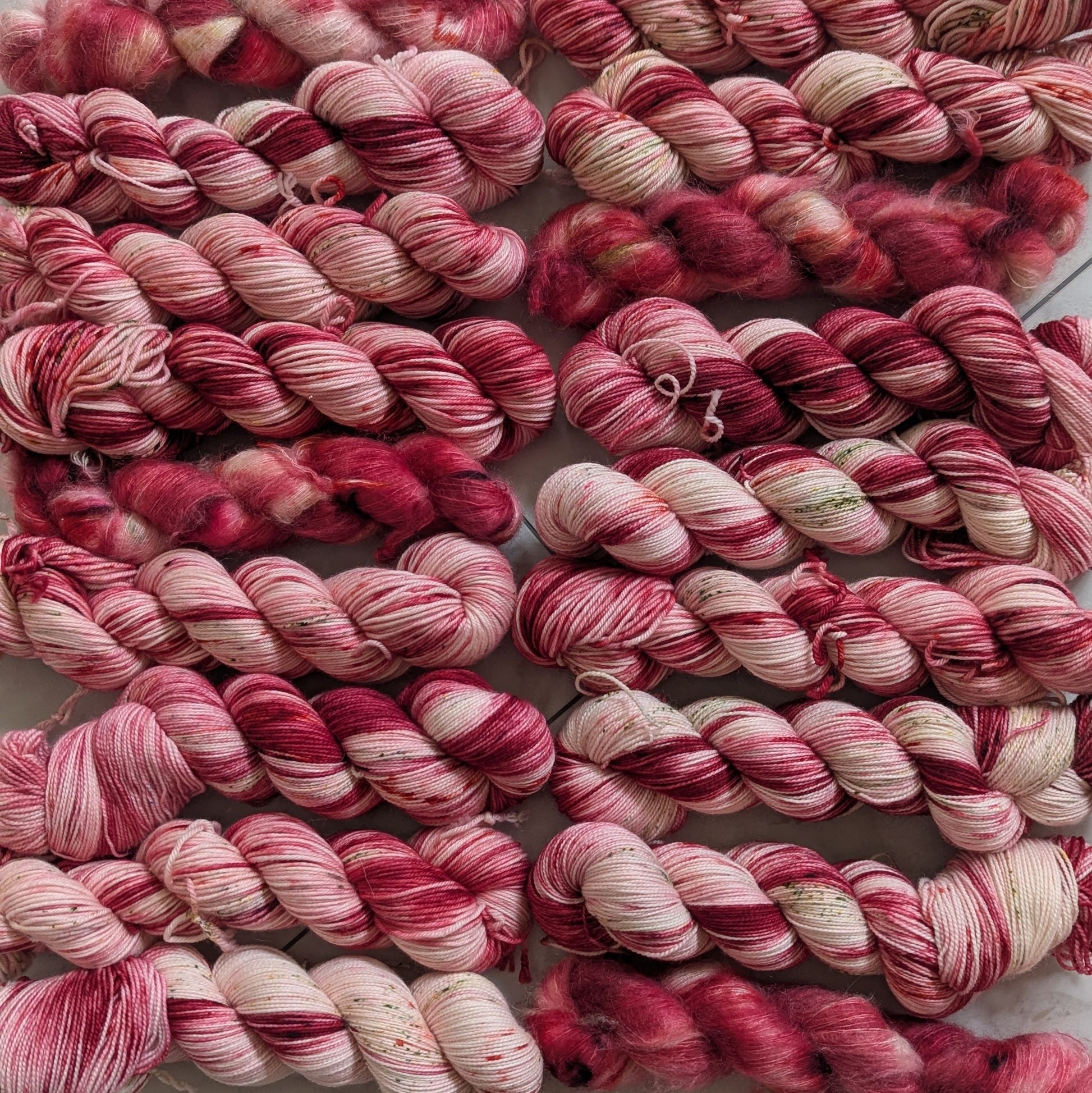 Meat Counter is a gently variegated colorway in which only one blended dye is poured over a bare base, and variations in the saturation level provide depth and interest. Then it's finished with sage and parsley speckles to garnish 💚