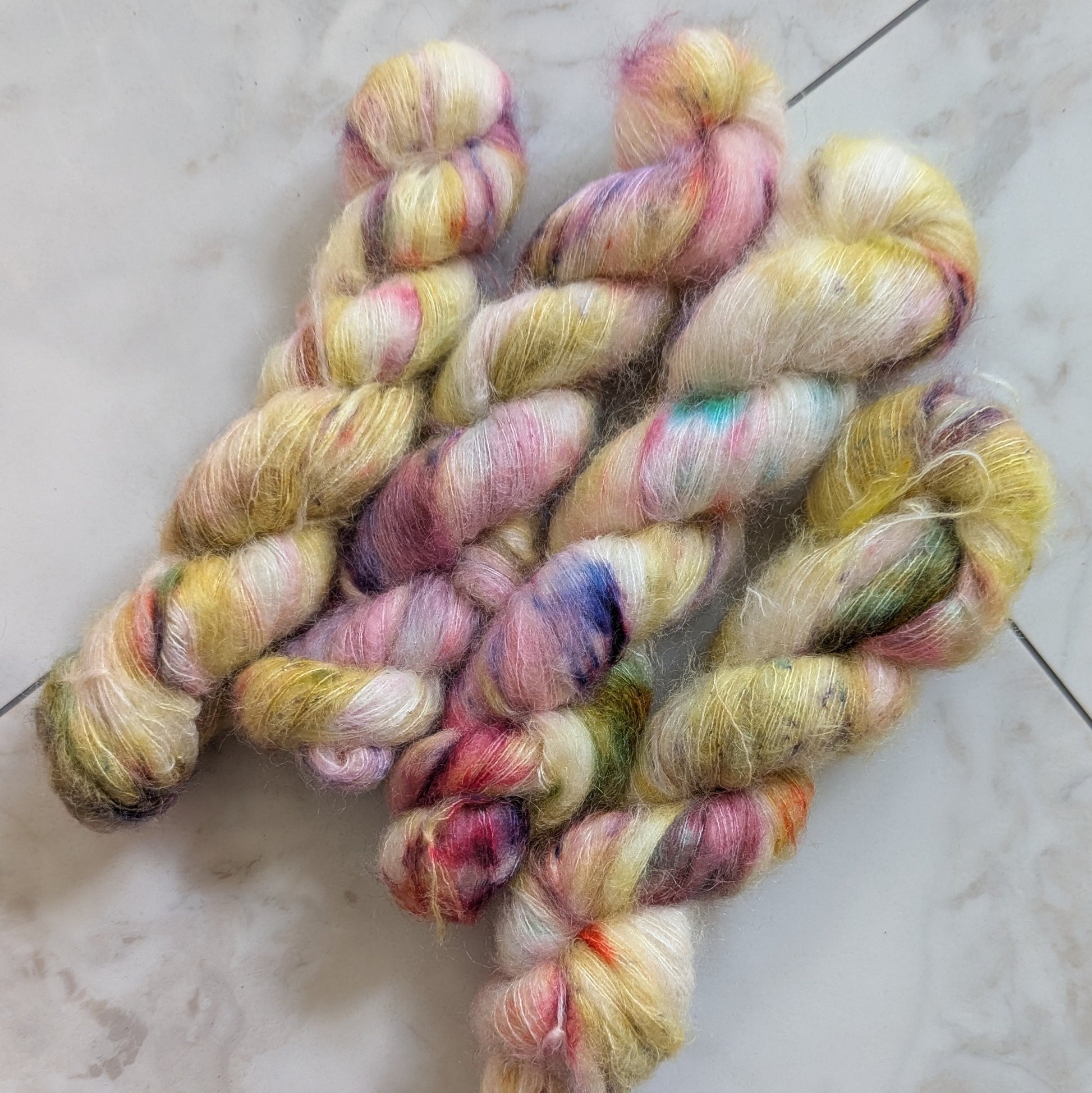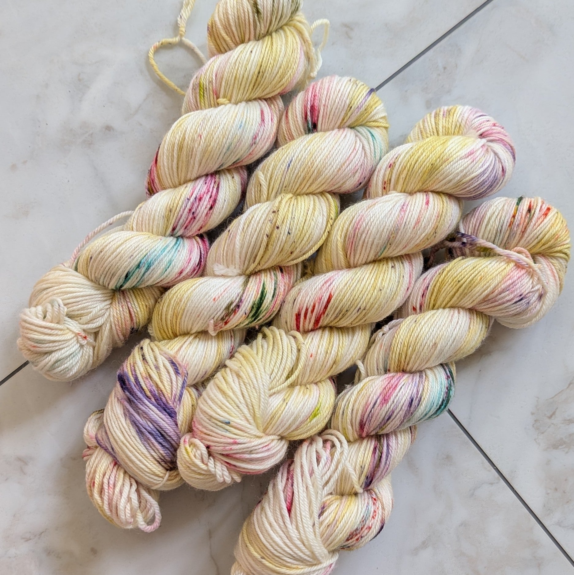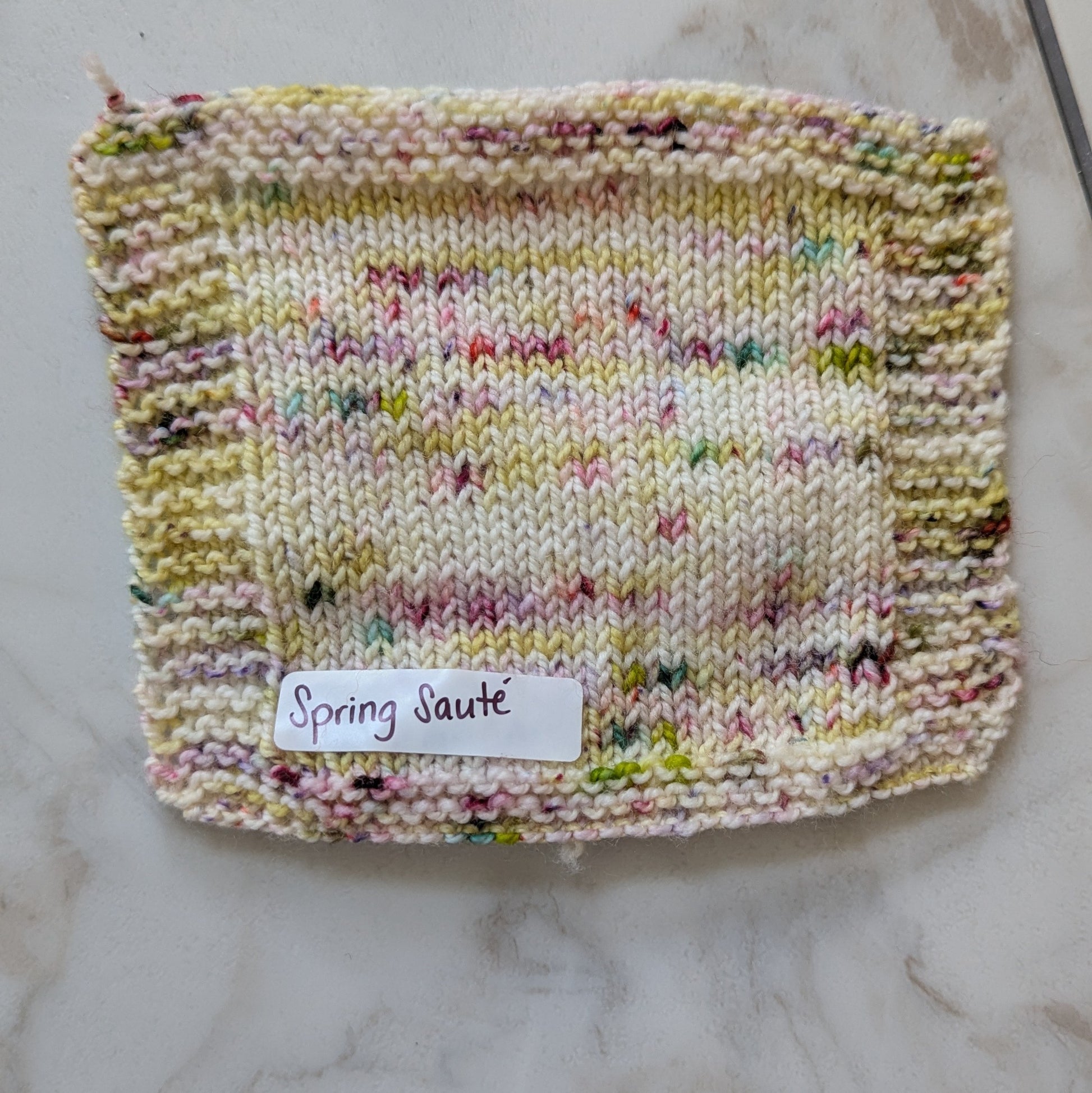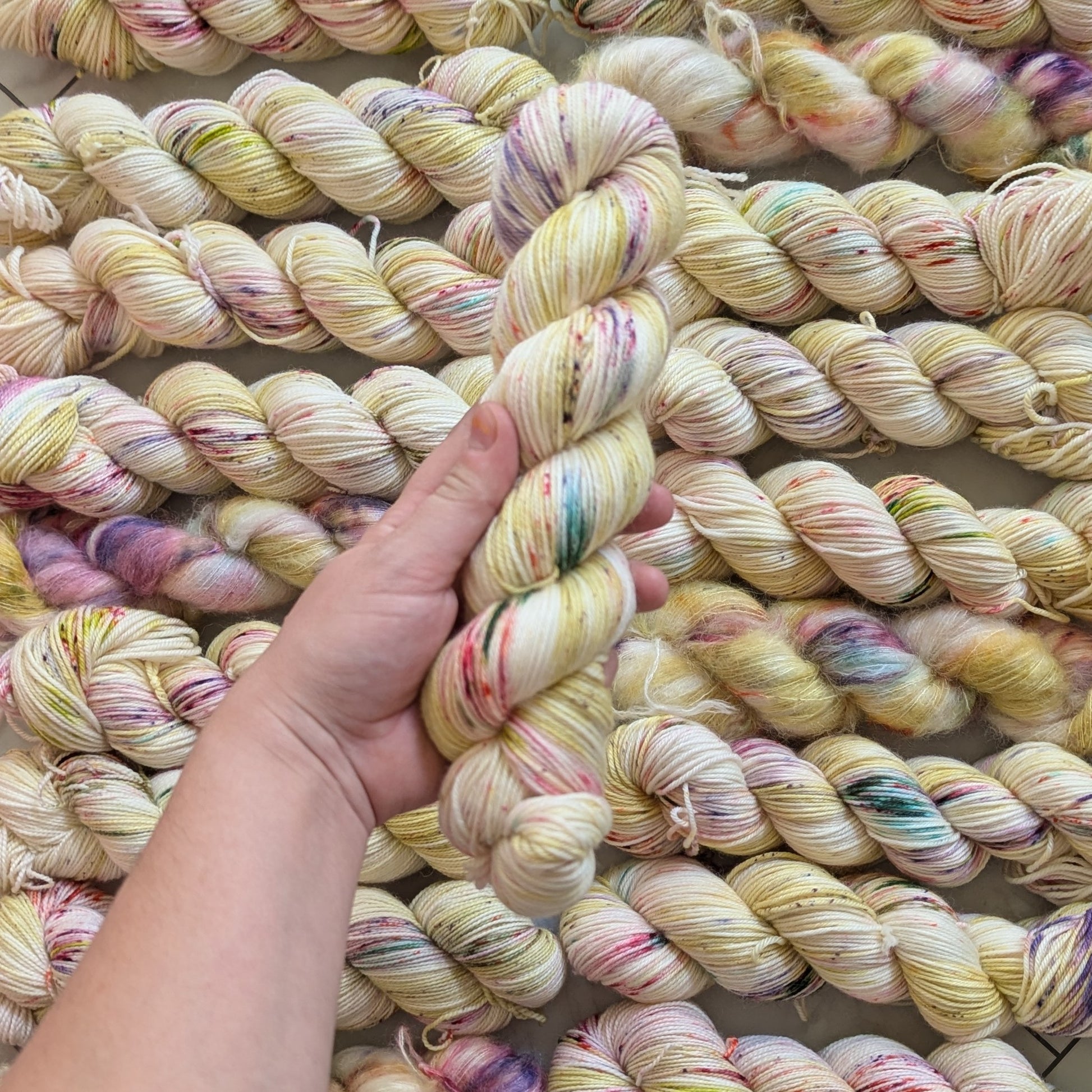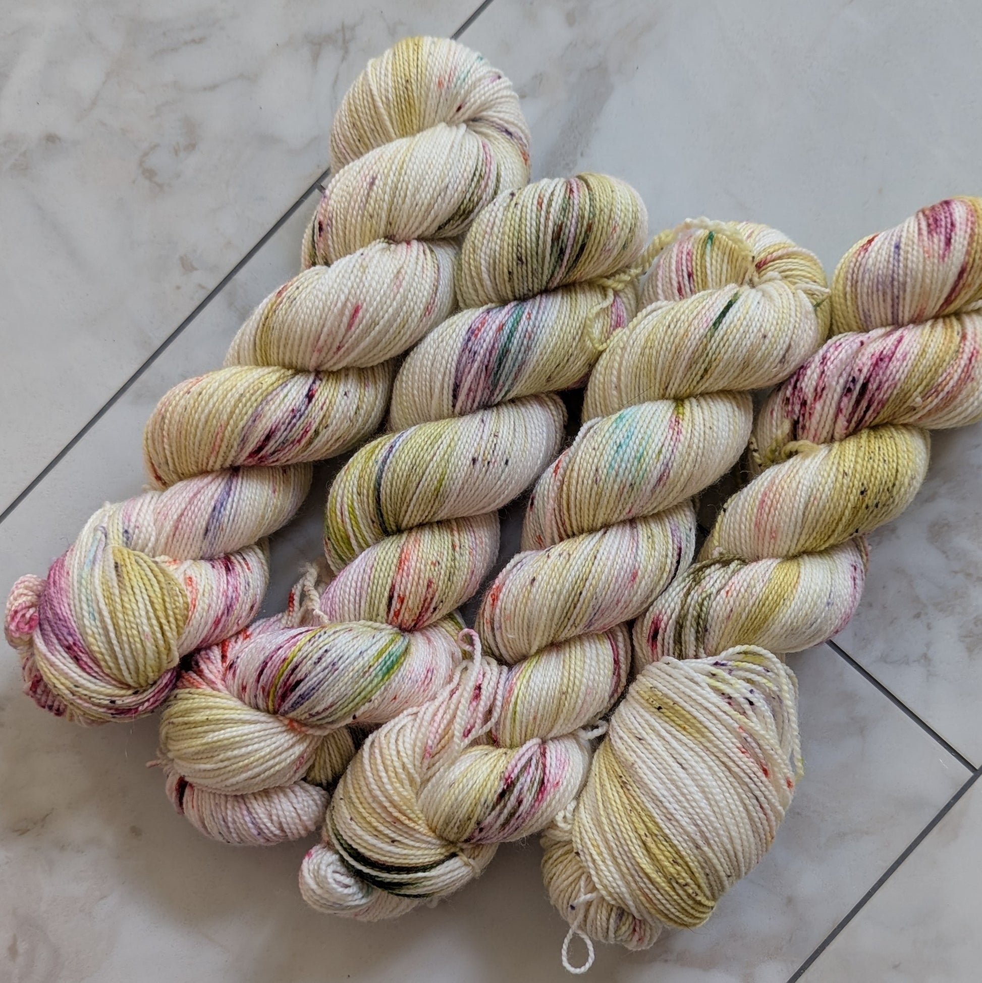 Spring Saute begins with a bare base crisscrossed with every fresh and springy green I could think of, speckled with bright orange and fuchsia. Then we do a pour over of a delicate yellow green and finish with black sesame seed speckles.